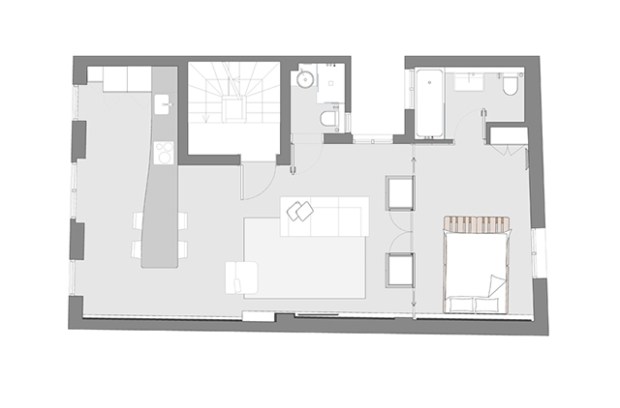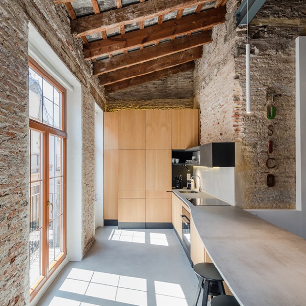 On apprécie aussi le choix des architectes concernant l’orientation des éléments. Les différentes interventions s’alternent verticalement (les colonnes de bois, les grands rideaux plongeant, la petite échelle) et horizontalement (le grand plan de travail de pierre de la cuisine, la petite étagère blanche longeant le mur de pierre laissé brut). Avec un budget limité, ce projet parvient à inventer un langage contemporain qui joue avec les texture et les matériaux de l’ancien.