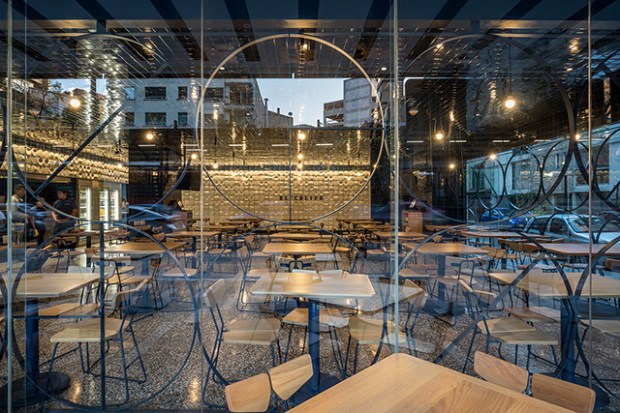 En contraste avec l’esthétique de la mosaïque, le sol est recouvert par un revêtement en terrazo qui se développe jusque sur le bar et le comptoir de la cuisine. Les vitrines sur l’extérieur reprennent elle aussi le motif du cercle, à l’aide d’une grille de cercles dorés. Enfin, l’atmosphère lumineuse est très chaude, de très nombreuses suspensions sont disséminées dans l’espace. Laissées à nu, elles inondent d’une lumière chaude le restaurant. Le mobilier et la vaisselle du restaurant ont été développés spécialement pour le projet. Des pièces de mobilier très simples en bois brut et métal bleu qui s’insère très harmonieusement dans le lieu.