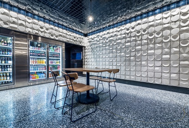 Mais l’élément le plus marquant du projet réside dans la multitude de mosaïques présentes dans le restaurant. Une alternances de carreaux en trois dimensions, et de carreaux traditionnels et brillants qui reflètent la lumière, presque à la manière d’un miroir. Cette mosaïque est très évocatrice et élégante, avec son jeu de volumes qui rend hommage à un des fondamentaux de la cuisine mexicaine: la tortilla.