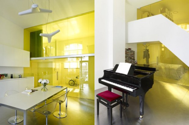 Aménagé par les architectes dmvA à Bruxelles, en Belgique, cet appartement d’un peu plus de 180m2 est organisé autour d’une grosse boite jaune et transparente, qui structure l’espace et y répand une tonalité colorée et acidulée.
