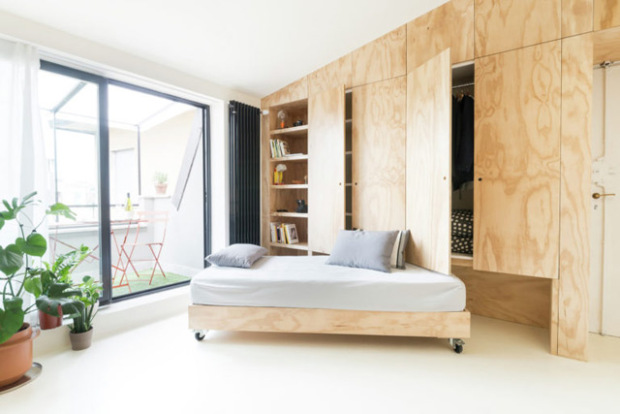Fruit du travail des architectes d’intérieur du studio WOK, ce petit studio de 28m² optimise l’espace avec deux « boites » qui renferment tout le nécessaire pour faire évoluer sa pièce à vivre. Rangement, salon, chambre à coucher, tout est là et dissimulé.
