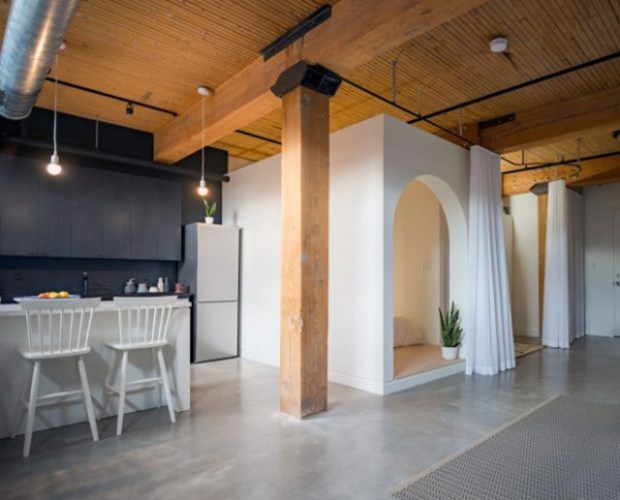 Pour aménager un appartement totalement ouvert tout en offrant une véritable chambre à coucher, l’idée développée par le studio StudioAC consiste à installer une « boite » dans la pièce à vivre, pour en faire un espace confortable et intime, sans pour autant dénaturer l’effet loft de l’appartement. Un simple rideau permet de la fermer.