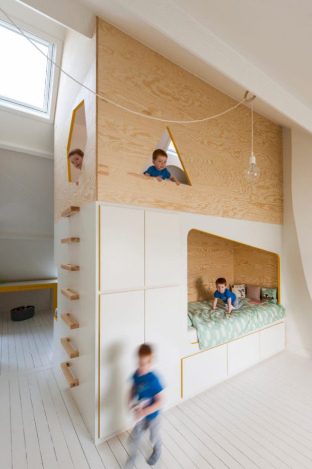 Le studio d’architecture Van Staeyen Interieur a imaginé la décoration et l’aménagement d’une chambre d’enfant particulièrement créative et ludique. Une grande cabane s’invite au beau milieu de la chambre et accueille deux lits dans des espaces séparés et même une salle de jeu à son sommet. La boite dans un chambre d’enfant, parfaite pour créer un lieu atypique qui stimulera l’imagination des plus jeunes.