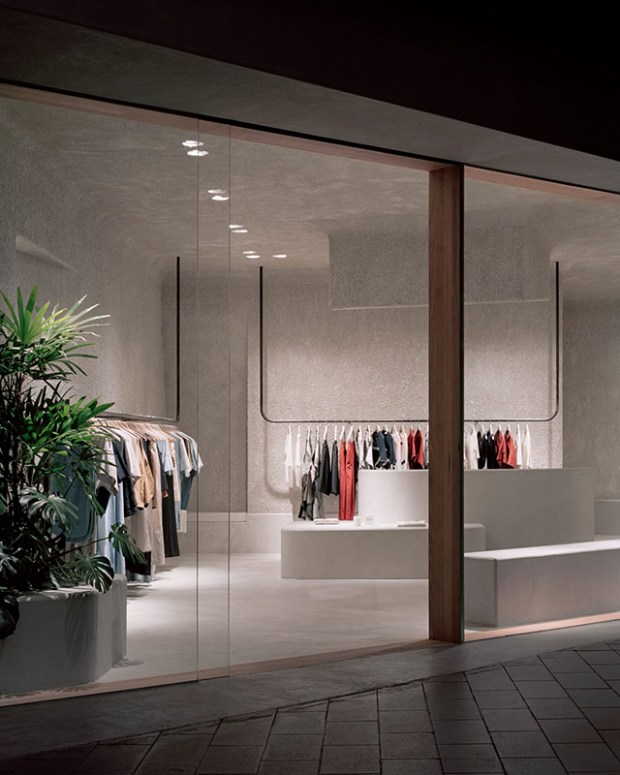 Pour compléter cette décoration, des panneaux en acajou australien encadrent le mur vitré et des plantes en pots sont placées dans les coins de la pièce pour ajouter de la texture et une touche organique. Nous apprécions aussi particulièrement les tringles qui jaillissent du plafond et cheminent dans la boutique, le résultat est élégant et n’entrave pas l’espace au sol.