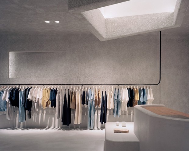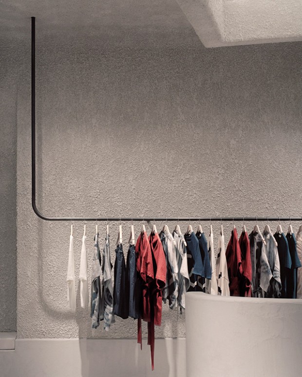 Un volume cubique asymétrique a été distendu du plafond pour former une fausse lucarne, complétée par des évidements angulaires dans les murs qui renferment des sources lumineuses. Il se dégage du lieu un sentiment de masse, comme si l’espace avait été sculpté comme un objet. La boutique invite à la curiosité et au calme tout en restant très neutre. Cela permet aux clients de se focaliser sur les vêtement colorés qui vienne égayer l’espace. Le béton lisse a aussi été utilisé pour fabriquer de grands présentoirs, dont l’un a été embossé avec le logo de la marque, et une caisse enregistreuse intégré et dissimulée.