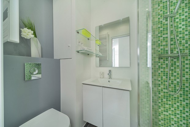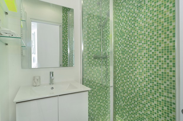 Pour la cellule de la salle de douche, l’architecte a souhaité intégrer une grande douche qui occupe la majorité de l’espace de la salle d’eau, et pour l’agrandir visuellement, une mosaïque en carreaux de 2,5 par 2,5 vient orner ses parois.