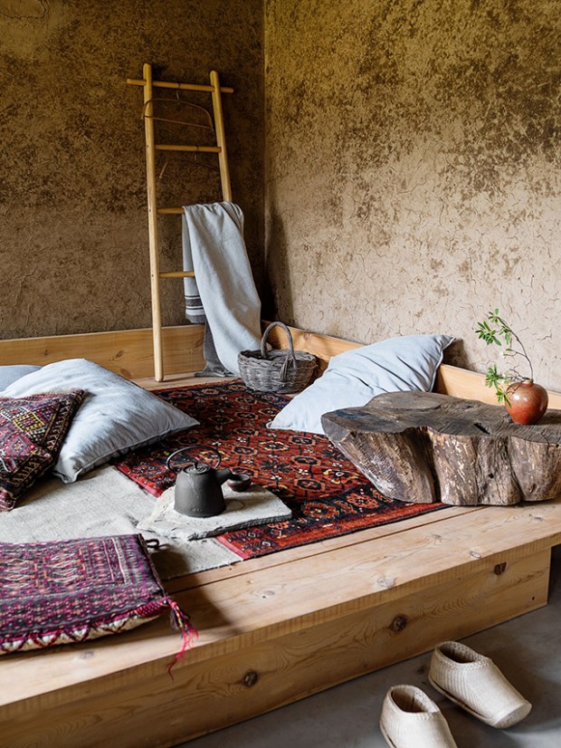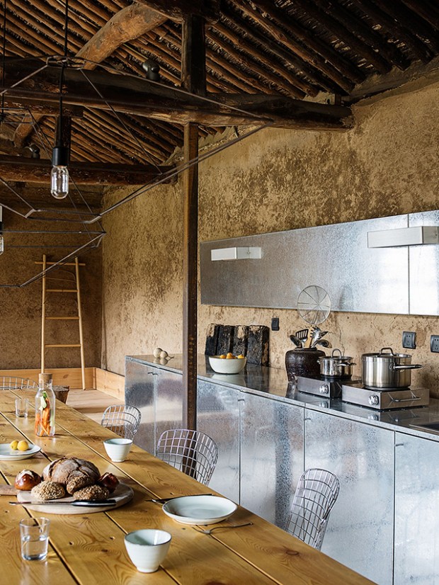 Sur le plan de la décoration, le mélange est tout simplement sublime. A la charpente de bois apparente et aux murs décrépis, sont associées des pièces de mobilier très contemporaines. La cuisine en aluminium, imposante et qui détonne dans l’environnement, les luminaires suspendus en tiges de métal qui viennent dialoguer avec la charpente, un coin lecture sur une petite estrade de bois qui accueille de généreux tapis colorés… Les détails foisonnent dans cet intérieur à la décoration inspirée et très soignée.