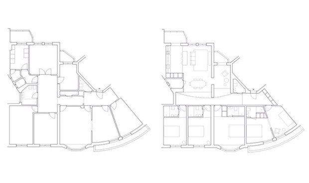 Il suffit d’observer les plans de cet appartement avant/après, pour apprécier le travail colossal qu’ont réalisé les architectes dans ce projet. Le schéma original était totalement fragmenté et confus, dépourvu de cohérence et de hiérarchie dans les différentes successions de pièces.