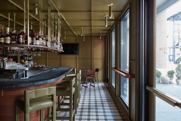 L’espace de 158 mètres carrés dispose d’un bar-club, d’un bar à huîtres et d’une vaste salle à manger. A l’intérieur, L’espace s’organise autour du bar à huîtres qui agit comme une zone tampon en séparant le bar-club, un espace intime recouvert de panneaux de bois couleur moutarde, et la grande salle à manger, à la décoration confortable et nostalgique à la fois. Les alcôves et les longues banquettes rembourrées courent le long de l’espace, et les panneaux de verre laissent filtrer la lumière. L’ambiance globale du lieu est relativement sombre et participe à la création d’un univers luxueux semblant hors du temps.