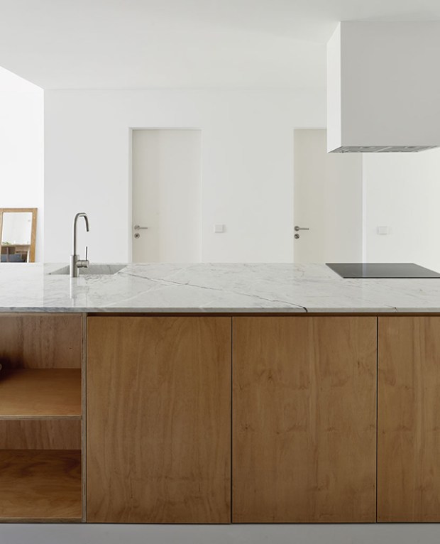 Il est simplement rehaussé d’un sol gris qui a pour effet de « poser » les éléments, de bois clair et de quelques touches plus originales comme le marbre ou les (très) rares pièces de mobilier colorées. En simplifiant le plan de l’appartement, les architectes parviennent aussi mieux connecter les différents espaces conviviaux ou intimes.