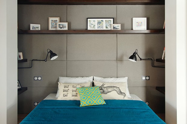 La petite niche derrière le lit est habillée de panneaux de tissu qui remplissent plusieurs rôle dans ce projet. A la fois tête de lit et isolants phoniques, il permettent de maquer visuellement la zone du couchage. Face au lit, une console TV a été installée. Elle se connecte au bureau pour relier les zones de l’appartement. La cloison du dressing a été laissée transparente avec ses portes coulissantes afin de ne pas priver le reste de la pièce de lumière naturelle.
