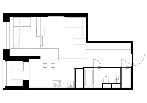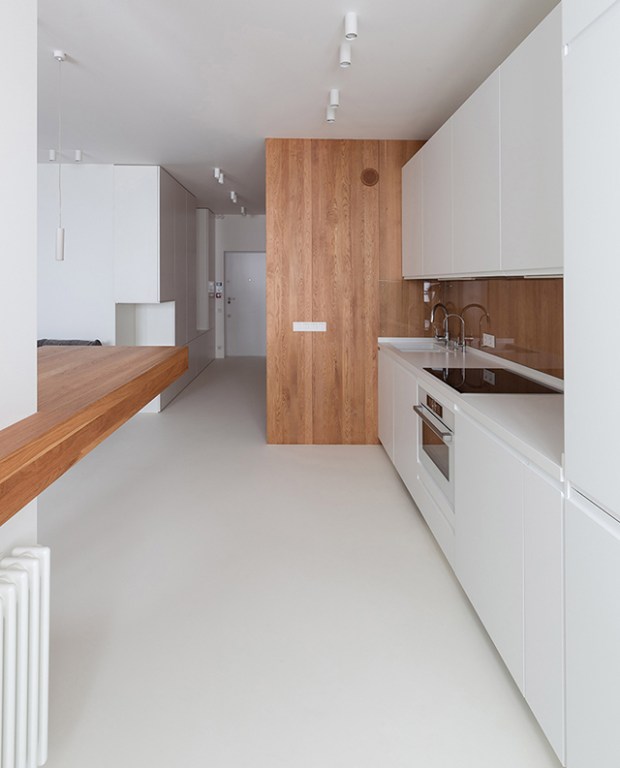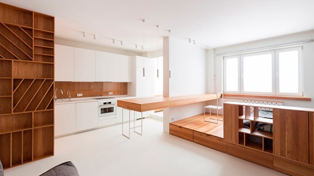 Cuisine, salon, chambre et lieu de travail, les différentes zones de l’appartement sont rythmées et séparées par ce simple module. Plutôt que d’utiliser des murs pour diviser l’espace, les architectes se sont concentrés sur la création de zones, définies via différents niveaux de plancher. Le design de l’ensemble s’articule autour de nombreux meubles encastrés en chêne massif. Ceux-ci comprennent une table qui se trouve entre la cuisine et la chambre, elle fonctionne comme une table à manger, un comptoir de cuisine et un bureau à la fois. Le lit est incorporé sur la plate-forme qui révèle une série de tiroirs. Un grand mur de rangement en chêne dissimule la salle de bain et s’étend de l’entrée jusqu’à la cuisine. Ce mur contient des armoires ainsi qu’une grille d’étagères ouvertes disposées horizontalement en diagonale.