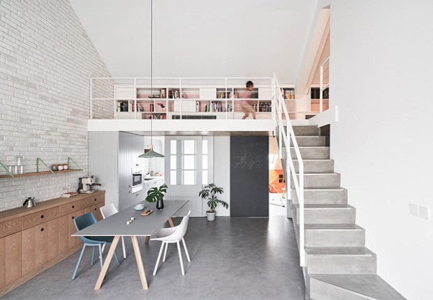 Afin d’utiliser au mieux le toit asymétrique de l’appartement sans perdre d’espace, une mezzanine accueille la chambre d’enfant et une salle de bains secondaire. Accessible par une série de marches en béton, le niveau supérieur comporte des étagères intégrées sur toute la longueur du mur. Un bureau en bois a également été installé dans un coin pour fournir aux clients un petit espace de travail. Au rez-de-chaussée, le salon décloisonné est agrémenté d’un canapé gris, de chaises rose et d’une suspension vert menthe. Des teintes claires et joyeuses que l’on dans la cuisine, avec ces armoires bleu pâle et un dosseret de carreaux blancs.