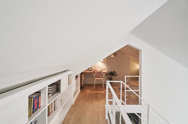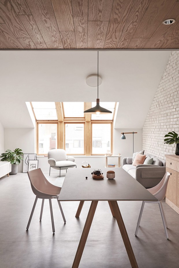 Pour faire des sous-pentes de cet appartement une force plutôt qu’une faiblesse, les architectes ont misés sur une approche lumineuse, complétée par de nombreuses pièces de mobilier pastel L’appartement, qui mesure 116 mètres carrés, a été aménagé pour devenir une agréable maison familiale qui conviendrait au style de vie du client.
