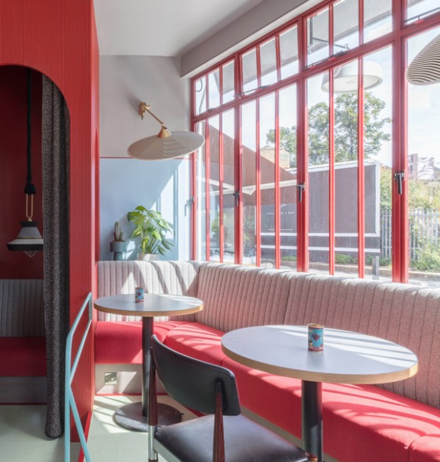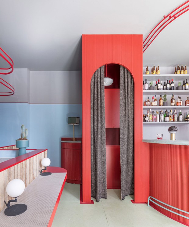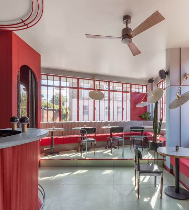 Cette alternance de zones permet aux clients de profiter d’ambiances distinctes mais connectées entre elles. Les palettes de couleurs et de matières du restaurant jouent essentiellement sur le contraste. Des carreaux de mosaïque bleus et blancs sont posés dans l’encadrement des fenêtres en métal rouge de la façade. A l’intérieur, le sol en terrazzo de jade fait face aux tapisseries rouges et bardage de lattes de bois du bar. Les chaises, les luminaires, et chaque meuble du projet ont été conçus sur mesure par Sella Concept.
