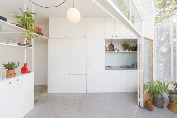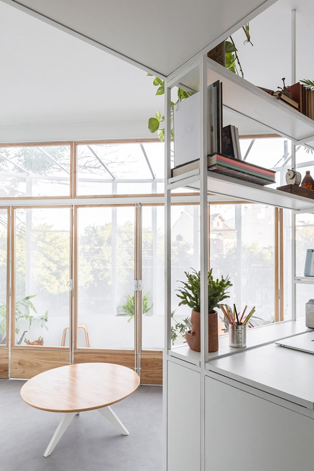 A l’intérieur, le résultat est tout aussi spectaculaire. La cuisine et la buanderie sont totalement intégrées dans un meuble qui permettent de les dissimiler totalement. Cet élément de menuiserie renferme par ailleurs une porte secrète qui permet d’accéder à la salle de bain. La chambre et le coin bureau s’installent sur une plate-forme surélevée, ce qui permet de créer une intimité par rapport au reste la pièce à vivre. Protégés par des rayonnages ouverts remplis de plantes, de livres et d’objets de décoration, ces espaces restent partiellement ouverts et profitent de la lumière naturelle tout en offrant un espace isolé.