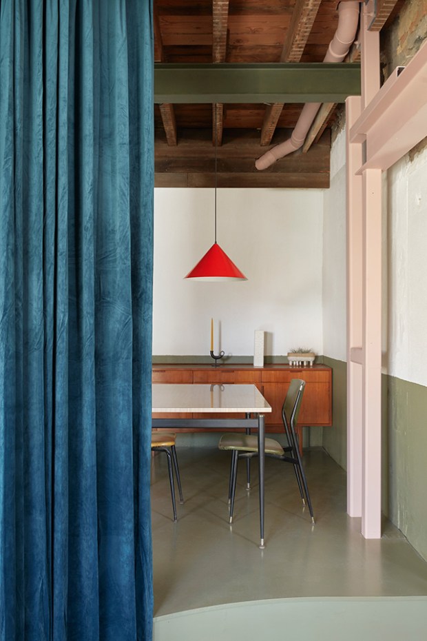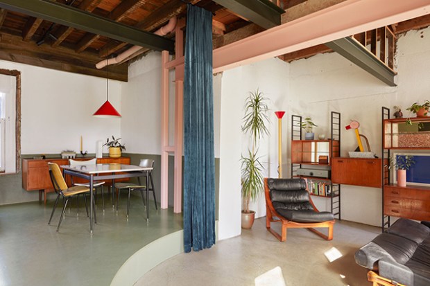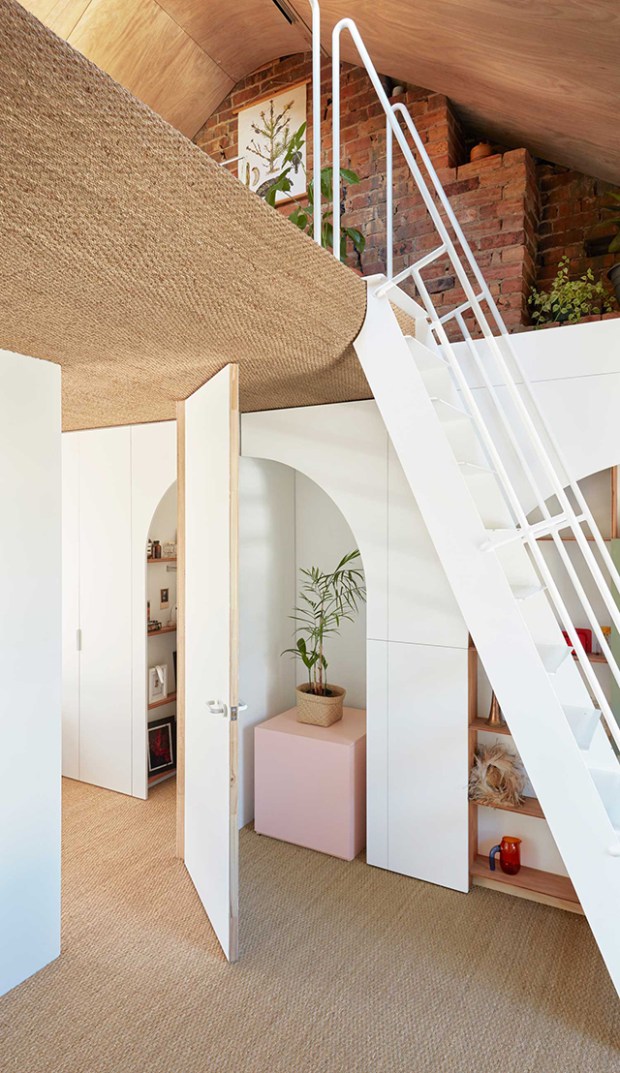 Pour débuter cette rénovation, les designers d’espace ont du s’attaquer à la structure du bâtiment. Cela a débuté par la destruction d’une partie de la structure du plafond afin d’y placer un petit bureau et une chambre en mezzanine. Ces démolitions ont aussi permis de remettre à jour certain éléments du passé, comme ces murs de briques qui ont été conservés en l’état. Les espaces à l’intérieur multiplient les transitions douces, cela passe par la création de demis-étages pour séparer la cuisine de la salle à manger, ou des parois courbes étonnantes pour séparer les espaces.