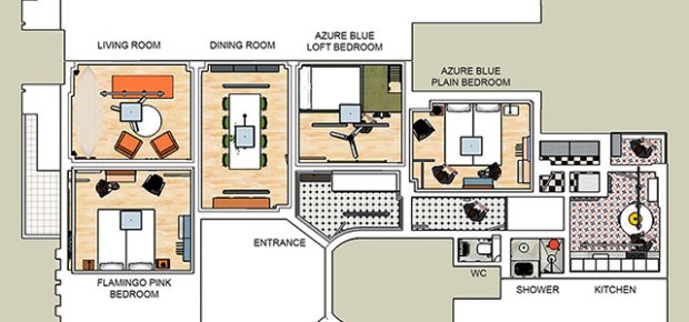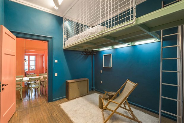 L’architecte grec a choisi trois couleurs pour organiser l’espace. Le rose est utilisé dans les espaces qui font face à la mer, le bleu azur est utilisé dans les espaces qui donnent sur le quartier et la couleur vert pastel est utilisée dans les espaces humides de l’appartement, tels que la cuisine, la salle de bain et les toilettes. En outre, pour permettre plus de flexibilité, le choix du mobilier s’est porté sur des pièces légères, empilables et pliables qui peuvent être utilisés dans diverses configurations et peuvent être facilement retirés et rangés lorsqu’ils ne sont pas utilisés. Si ce sont les couleurs qui frappent, le mobilier se fait quant à lui plus discret (et heureusement sinon le résultat aurait été indigeste).