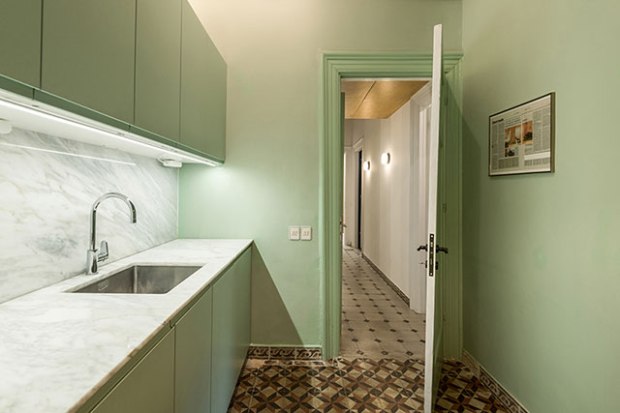 Dans cette rénovation, l’architecte a aussi su conserver les accessoires art-déco d’origine, tels que le sol, les encadrements de portes et fenêtres en bois massif et les moulures en plâtre orné du plafond. Cela créé un contraste intéressant avec toutes ces couleurs. Dans la cuisine, les armoires vert pastel aux lignes épurées ont été installées et fonctionnent particulièrement bien avec le sol en dalles de ciment géométriques rouges et noirs.