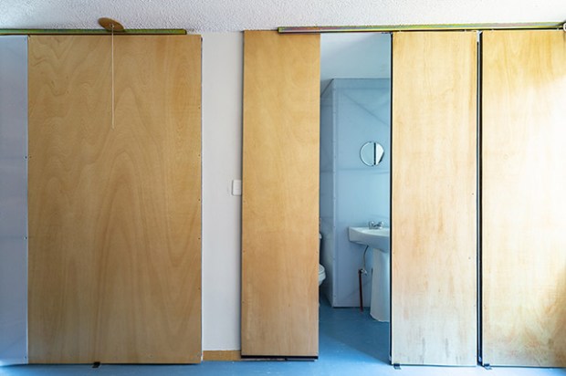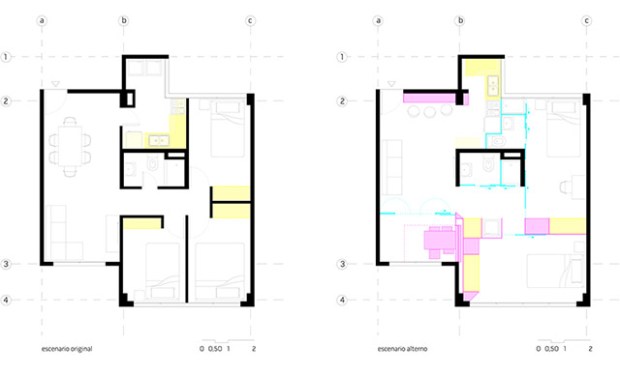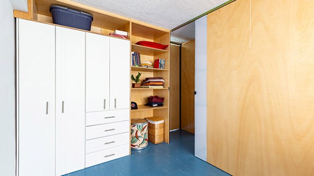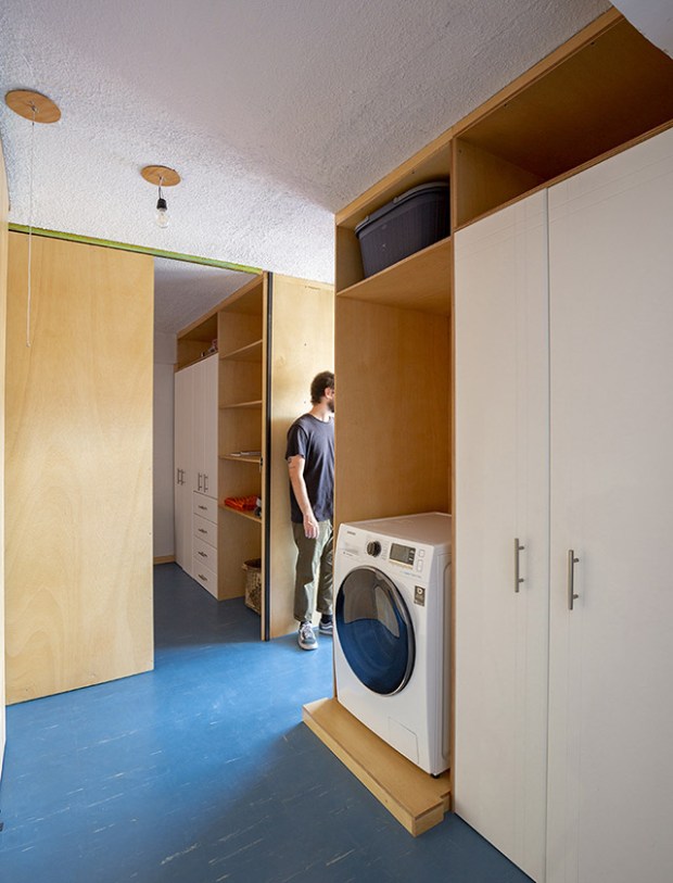 Pour choisir les matériaux qui composent ces espaces, les architectes ont examiné les ressources disponibles. Les armoires et les meubles de cuisine sont réutilisés et insérés dans de nouveaux modules composés de feuilles de contreplaqué. Une solution économique qui permet d’augmenter la capacité de stockage et configurer simultanément les divisions entre les espaces. Pour libérer les circulations, les architectes ont par ailleurs opté pour des portes coulissantes. Elles ont été fabriquées à partir de structures métalliques récupérées.