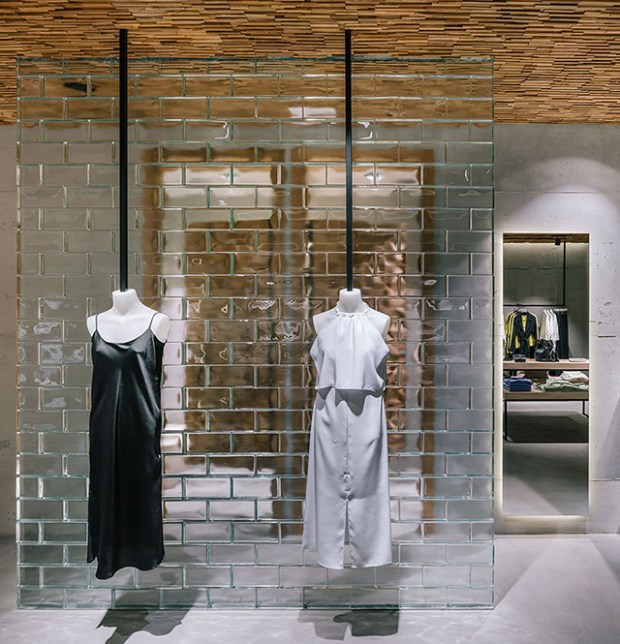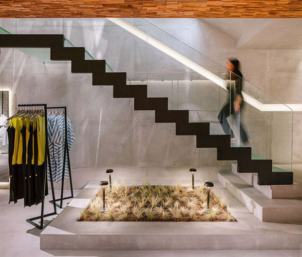 L’espace se présente ici comme une boite de béton nue et que les architectes ont subtilement habillée. Qu’il s’agissent des pans de murs végétalisés, des plafond bardés de bois de récupération, des petit espaces plantés ou encore des escaliers de verre et métal, tout contribue ici à faire de cet espace une sorte de sanctuaire. Les espaces sont claires et lumineux, notamment en raison de la suppression de la cage d’escalier désormais totalement ouverte. Nous aimons aussi particulièrement l’idée d’un mur de brique de verre, qui vient dissimuler partiellement la zone d’essayage sans pour autant couper les vues et l’espace.
