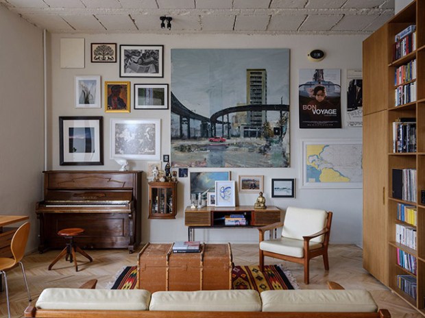 Une atmosphère vivante qui s’articule essentiellement autour de pièces vintage, d’affiches et tableaux, mais aussi en intégrant des objets chers au propriétaire, comme le piano familial. L’évier de la cuisine appartenait à l’arrière-grand-père et le portrait dans la chambre est une œuvre du père du propriétaire. Autant de détails qui, bien que nous ne connaissions pas cette personne, font de cet appartement un lieu chargé d’histoire et très personnel malgré sa rénovation complète et récente.