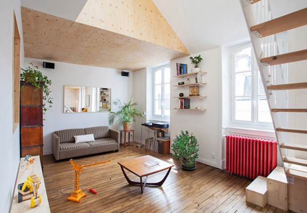 Direction la ville de Rennes pour découvrir ce duplex créé par Marie Blanchot et Charles Motte, fondateurs du studio mAAb. Les deux architectes de formation, ont transformé les combles d’un appartement en y ajoutant des volumes de bois suspendus pour créer une mezzanine. Une solution aussi efficace qu’élégante avec ces « boites » venant se nicher au creux des sous-pentes. Cet appartement a aussi subi de nombreuses rénovations tout en respectant l’existant. Ce que nous avons aimé et nos conseils déco juste après la visite en images :