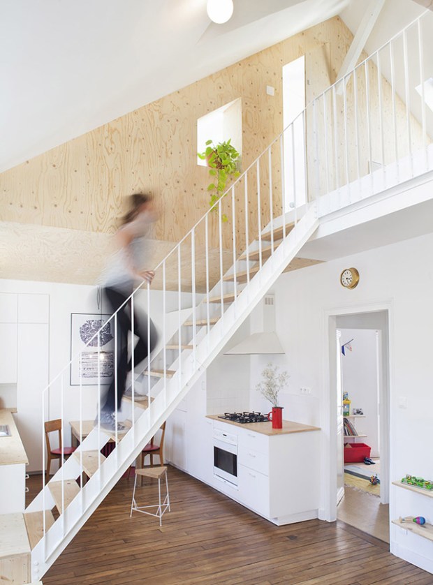 Pour cet appartement situé au sommet d’un petit immeuble du centre de Rennes, l’objectif était de fournir aux occupants plus d’espace. L’idée à donc été d’insérer dans les combles jusqu’alors inoccupés des modules fabriqués en pin pour créer une mezzanine et ainsi transformer cet appartement en duplex. L’appartement imaginé pour une jeune famille (un couple avec un enfant), se compose de deux chambres à coucher, d’une douche, d’un bureau et d’un grand espace ouvert où un escalier minimal sert de séparation transparente entre la cuisine et le salon, permettant ainsi de fluidifier les zones de vie. Un espace de vie décloisonné où les ajouts semblent flotter dans les airs.