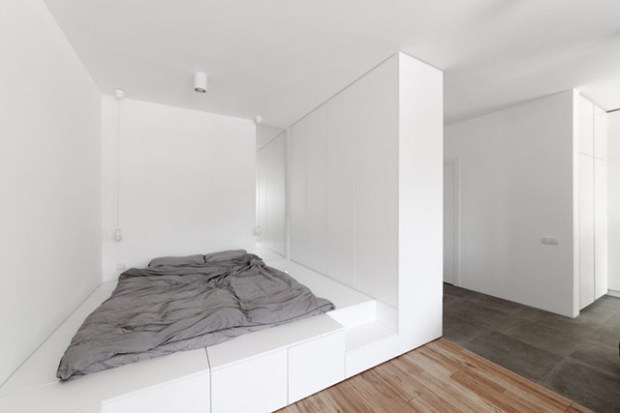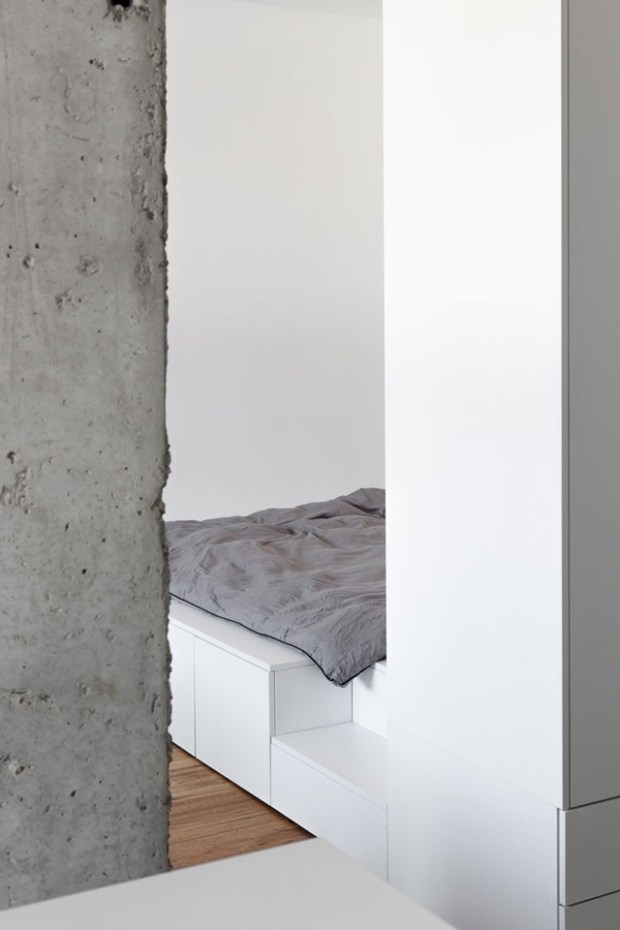 Dans ce très beau projet, l’espace a été organisé de manière à optimiser les fonctions principales du logement. Pour ce faire, l’architecte a imaginé un espace de rangement intégré et un cadre de lit sur mesure qui ont servi de base à tout l’aménagement de l’appartement. Placé dans le salon, le lit trône sur une estrade blanche qui renferme des rangements et se prolonge dans le salon pour offrir des solutions de rangement et limiter l’ajout de mobilier annexe. Cette plateforme fait par ailleurs office de paroi au niveau de la tête de lit, qui renferme un dressing accessible des deux côtés. Avec un intérieur à la palette presque exclusivement blanche, le designer a pu concentrer son attention sur de petits détails qui vont capter l’attention du visiteur.