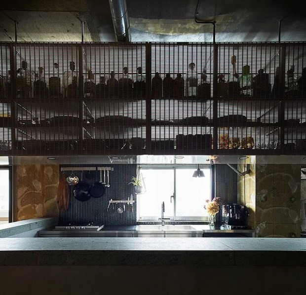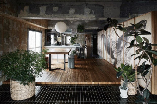 - Nous aimons particulièrement le mélange des styles : murs décrépis, bois omniprésent, élément traditionnels de la décoration japonaise.