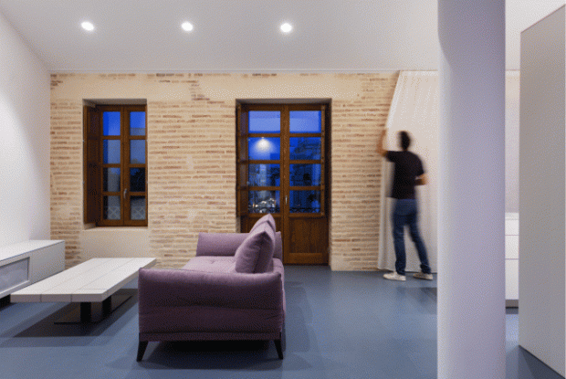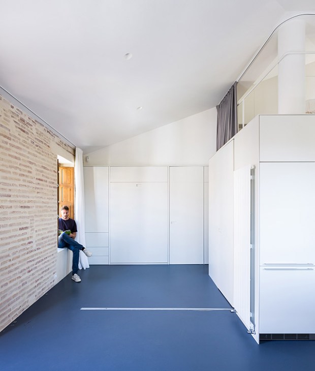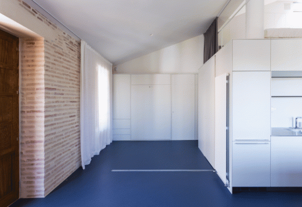 Nous restons en Espagne pour vous faire découvrir un superbe loft aménagé dans les combles d’un immeuble de Valence. Cette transformation d’un grenier en habitation est le fruit du travail du studio d’architecture NADA qui a imaginé ce projet pour un jeune propriétaire. Le projet « Loft 01« , c’est son nom, est imaginé comme un petit duplex et organisé autour d’une boite renfermant les fonctions essentielles de l’appartement. Un mariage heureux s’opère entre cette boite blanche immaculée, le sol bleu et les murs de briques d’origine. Ce que nous avons aimé et nos conseils déco juste après la visite en images :