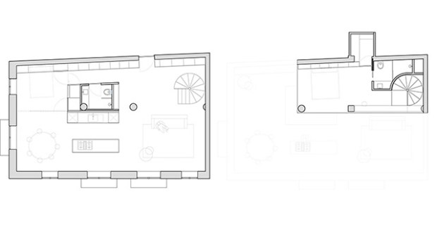 Pour relier ces deux étages et les différentes zones de l’appartement, les architectes ont eu la bonne idée (lumineuse ?) d’utiliser la proximité du toit pour baigner l’espace de lumière. Un cube a été conçu comme l’élément central de l’aménagement du loft. En son sein, sont regroupées toutes les zones de services : cuisine, salle de bains, buanderie et espaces de rangement. Ce cube central comporte également un système de séparation intégré qui permet de définir des espaces qui apparaissent et disparaissent en fonction des différents besoins.