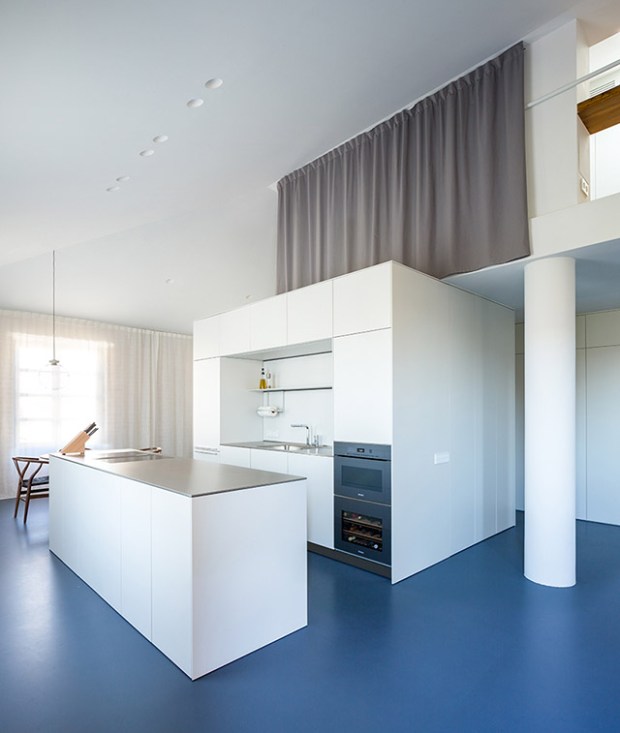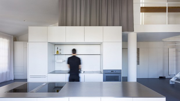 Pour relier ces deux étages et les différentes zones de l’appartement, les architectes ont eu la bonne idée (lumineuse ?) d’utiliser la proximité du toit pour baigner l’espace de lumière. Un cube a été conçu comme l’élément central de l’aménagement du loft. En son sein, sont regroupées toutes les zones de services : cuisine, salle de bains, buanderie et espaces de rangement. Ce cube central comporte également un système de séparation intégré qui permet de définir des espaces qui apparaissent et disparaissent en fonction des différents besoins.