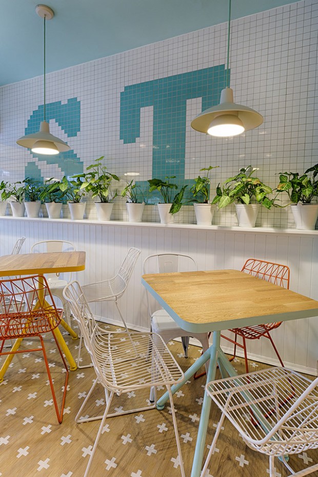 Dans la première partie, le bois, le blanc et un bleu clair dominent l’espace. Seul le mobilier très coloré sur ses tranches laisse présager le déferlement de couleurs que l’on trouvera en approchant de la zone du comptoir. Les chaises, certains murs et les détails des tables sont en métal, tandis que les banquettes rembourrées apportent de la rondeur et de la douceur. Aux murs, des surfaces réfléchissantes et des mosaïques s’invitent dans l’espace.