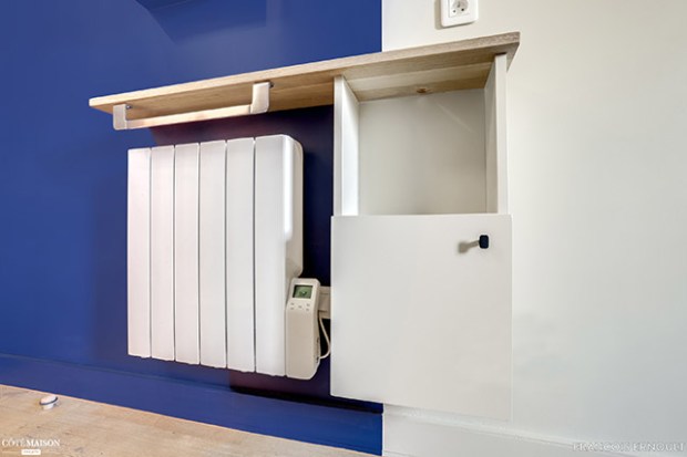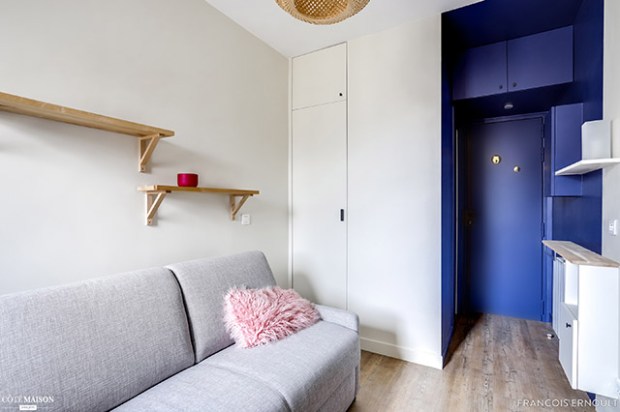 Pour donner un plus grand sentiment d’espace, cette zone est une alliance de blanc et de bois. L’entrée quant à elle est traitée en bleu outremer, une idée très intéressante car en plus de crée une délimitation marquée entre l’entrée et l’espace de vie, ce coin plus sombre semble plus lointain lorsqu’il est observé de la pièce à vivre. Une petite astuce qui permet de favoriser le sentiment d’espace. C’est tout bête, mais il fallait y penser !