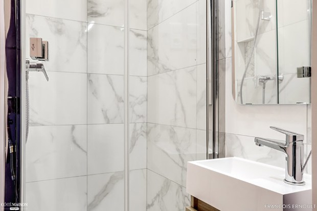 Il était donc nécessaire de chercher à isoler l’espace pour préserver le calme dans le studio. La salle de bain a donc été placée comme une zone tampon sur l’extérieur. L’idée était de placer en périphérie toutes les fonctions techniques, la cuisine se trouvant à l’autre extrémité de la pièce à vivre. Pour économiser un peu d’espace et faciliter les circulations, elle s’ouvre au moyen d’une porte coulissante à galandage. A l’intérieur, elle se pare de murs rose pâle et la douche est pavée de carrelage imitation marbre. Dans le prolongement de ce volume, un dressing est installé côté salon.