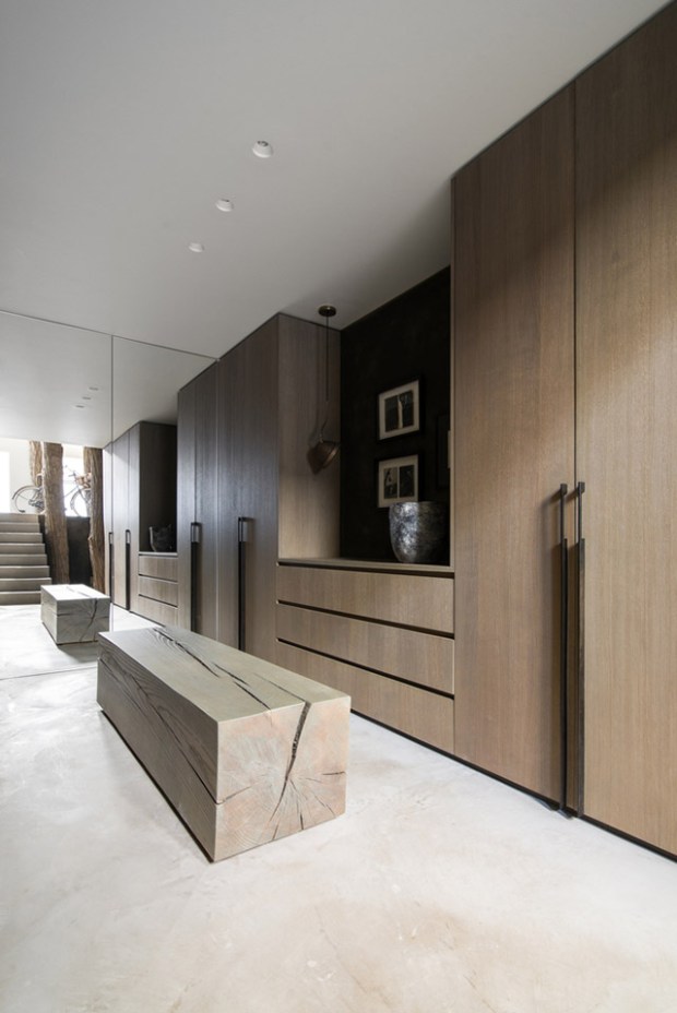 Teintée de tons sombres qui apportent sérénité, calme et tranquillité, cette maison réussi là où de nombreux décorateurs n’osent pas, miser sur le noir ! Deux axes ont guidé ce travail d’architecture autant que de décoration : l’espace et la lumière. On pénètre dans cette maison par une entrée aux murs d’argile teintée et de véritables troncs d’arbres. Le ton est donné, nous sommes en ville mais la nature est omniprésente.