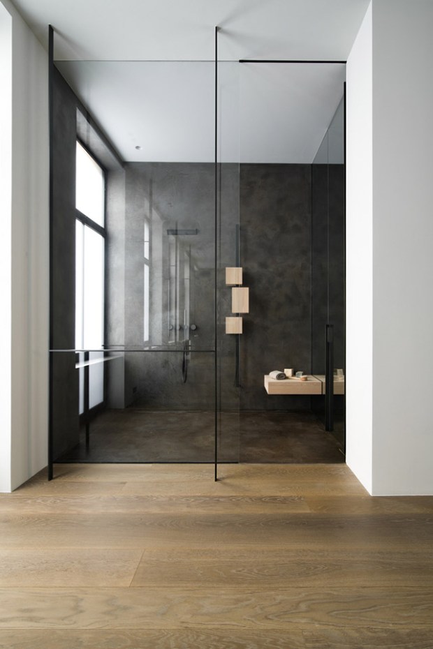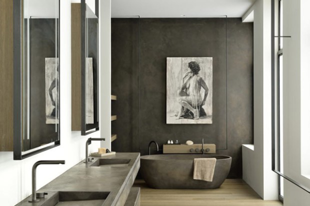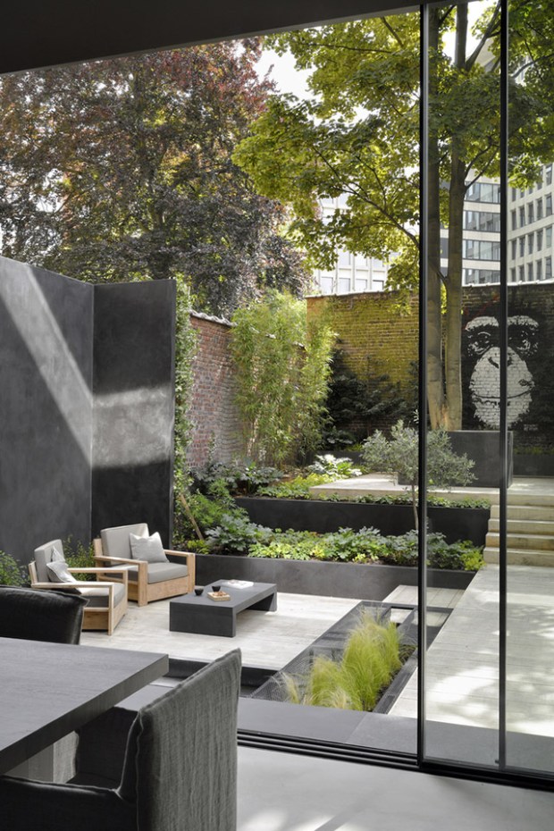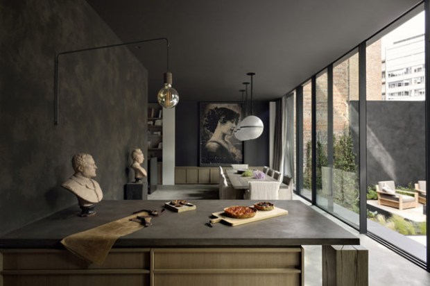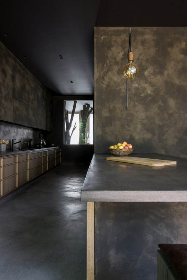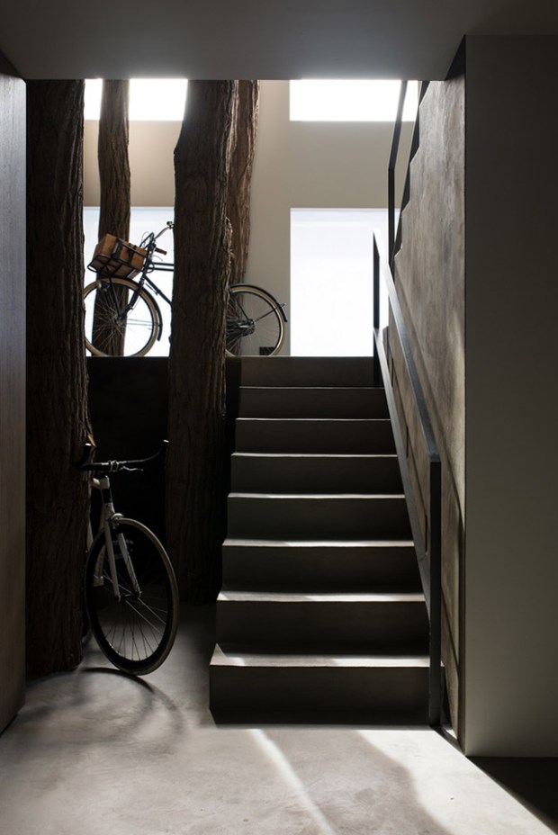 Teintée de tons sombres qui apportent sérénité, calme et tranquillité, cette maison réussi là où de nombreux décorateurs n’osent pas, miser sur le noir ! Deux axes ont guidé ce travail d’architecture autant que de décoration : l’espace et la lumière. On pénètre dans cette maison par une entrée aux murs d’argile teintée et de véritables troncs d’arbres. Le ton est donné, nous sommes en ville mais la nature est omniprésente.