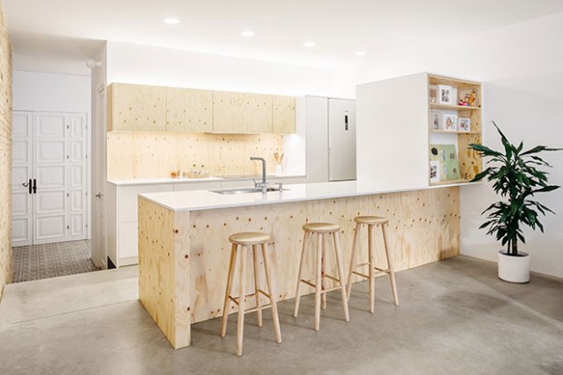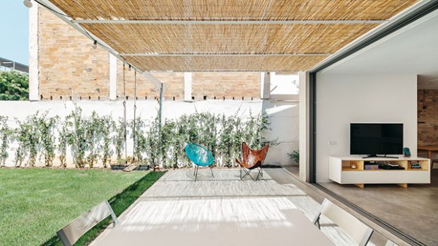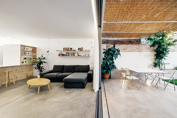 L’entrée du rez-de-chaussée, revêtue de carreaux d’origine débouche sur une grande cuisine ouverte, une salle à manger et un salon. Cet espace ouvert était à l’origine divisé en six pièces individuelles ! Un gros travail a donc été effectué pour ouvrir l’espace et les vues, donnant à cette habitation une tonalité bien plus adaptée à la vie moderne. Cette nouvelle disposition, permet en outre d’améliorer la ventilation. Une porte coulissante ouvre encore plus l’espace et donne sur le jardin, où un généreux patio est drapé d’une pergola en bambou pour les repas en plein air. Une bonne idée a été de d’utiliser le même revêtement de sol sur le terrasse et dans le salon. C’est très simple mais cela permet de créer une unité très intéressante entre le dehors et le dedans. Avec le climat espagnol et cette grande baie vitrée, la frontière tend à être mince, et c’est donc une belle astuce déco facile à reprendre.