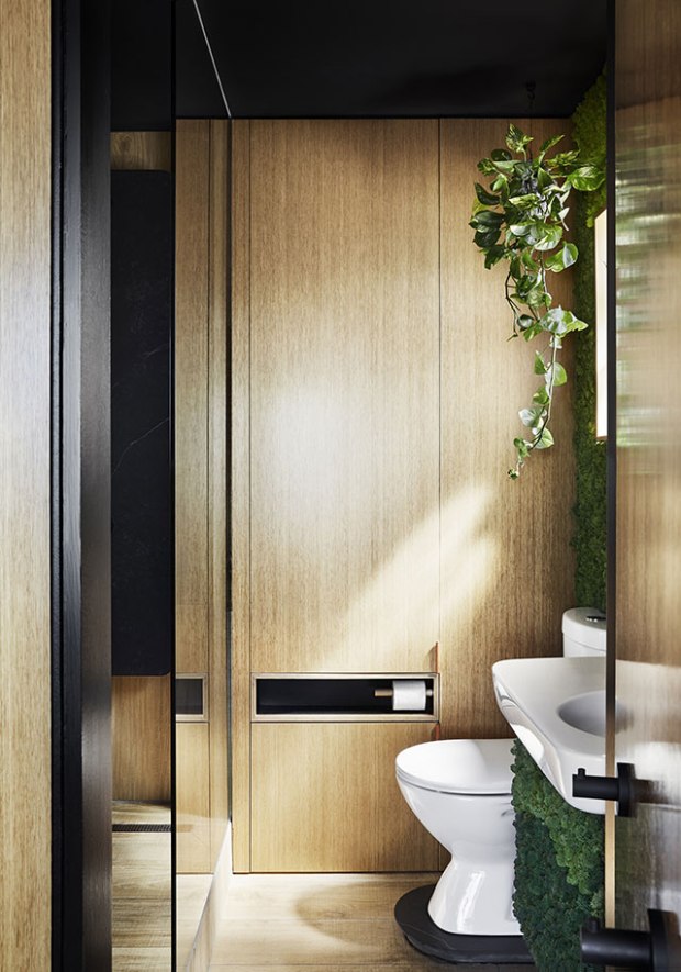 Dans la salle de bains, l’architecte a cherché à créer l’illusion d’un espace en extérieur, avec un mur accueillant un petit jardin vertical. Enfin, comme nous en avons l’habitude dans cet appartement, un petit étendoir est lui aussi encastré et dissimulé dans un mur de la salle de bains.