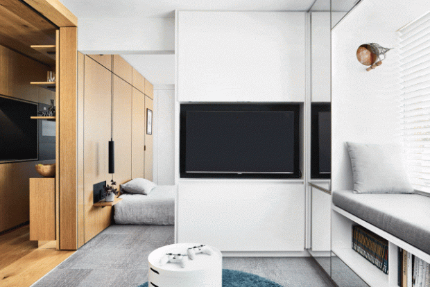 Comment intégrer dans un appartement de 35m² toutes les fonctions nécessaires sans pour autant alourdir l’espace ? Dans ce petit appartement, il ne manque rien. Une chambre à coucher, un coin bureau, une table à manger et une cuisine bien aménagée trouvent leur place et s’intègrent harmonieusement malgré le manque d’espace. Pour parvenir à ce résultat, l’architecte a multiplié les idées originales. Une table de salle à manger qui disparaît dans le mur, un jardin de verdure vertical dans la salle de bain, des tables de nuit escamotables, autant de détails de conception particulièrement bien pensés.