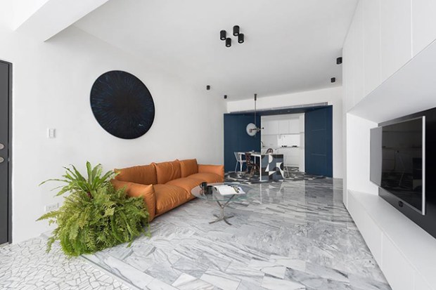 Le salon combine des accessoires noirs à ces surfaces blanches et bleues pour créer une palette très graphique et inspirée. Cet effet est renforcé par l’ajout d’un carrelage géométrique dans la cuisine et la salle à manger qui réunit toutes ces couleurs d’une manière inattendue. Pour apporter des touches plus organiques et plus chaudes, les architectes ont ajouté quelques plantes vertes, un canapé de cuir et on notera même que les chaises de la salle à manger sont dépareillées, certaines filaires en métal blanc, d’autres en bois et bien plus traditionnelles.
