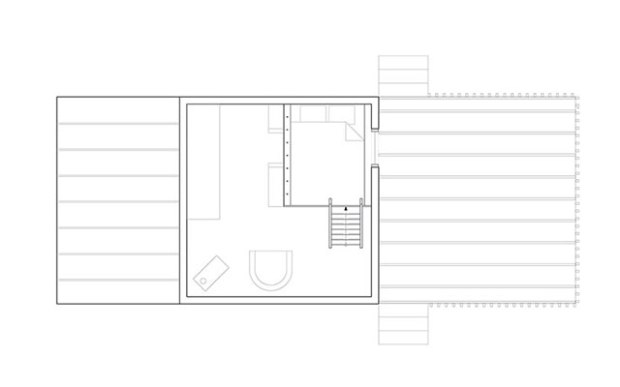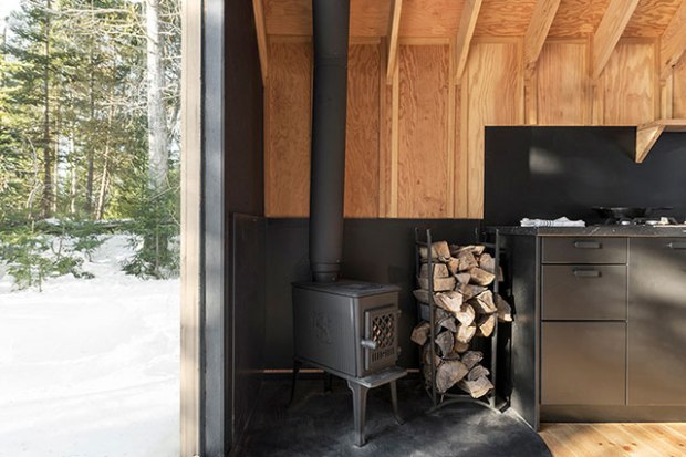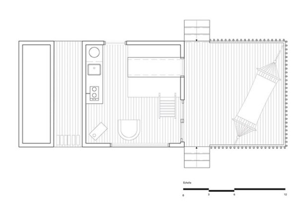 Au rez-de-chaussée, une petite cuisine, un poêle à bois et une table à manger et ses bancs encastrés constituent les seuls éléments de mobilier. On notera toutefois deux originalités de taille, la chaise suspendue qui invite à se balancer doucement en admirant le paysage et la table qui se transforme en… lit d’appoint ! Une échelle inclinée mène à la petite mezzanine qui abrite le couchage principal.