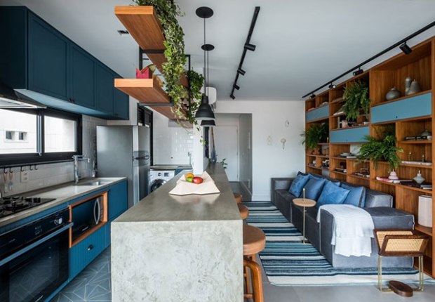 Passons sur ce détail pour nous intéresser aux travaux de décoration réalisés ici. La première chose qui frappe est la combinaison audacieuse des éléments rustiques et des nuances de bleu qui se déclinent dans tout l’appartement. Pour commencer les architectes se sont concentrés sur la création de l’espace de vie.