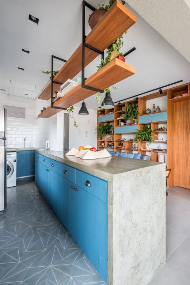 La cuisine ouverte reprend les mêmes couleurs que le salon, des tons de bleu et différentes textures bois. Un imposant buffet en béton commence dans le hall et se déploie dans l’espace pour se transformer en comptoir. Un banc a été incorporé en dessous pour apporter des assises supplémentaires.