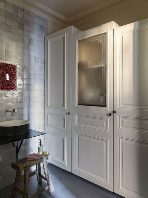 La salle-de-bains avec ses carreaux de céramique irréguliers qui texturent l’espace, son mobilier rustique et ses équipements gris mats très contemporains.