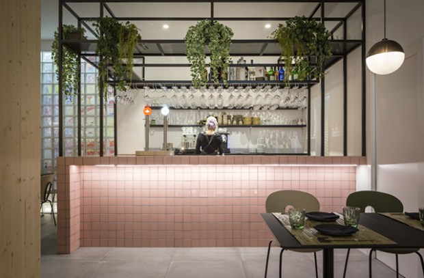 Si le restaurant penche vers le minimalisme, il est loin d’être austère avec un heureux mélange de couleurs et de matériaux chaleureux. Des motifs quadrillés sont répétés dans tout l’espace, que ce soit via le carrelage, les poutres ou encore les briques de verre.