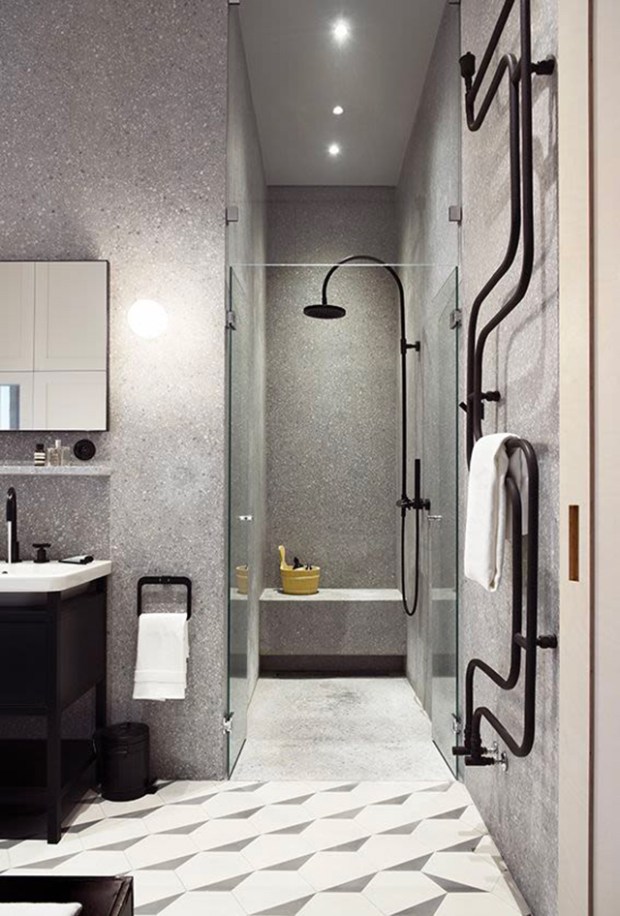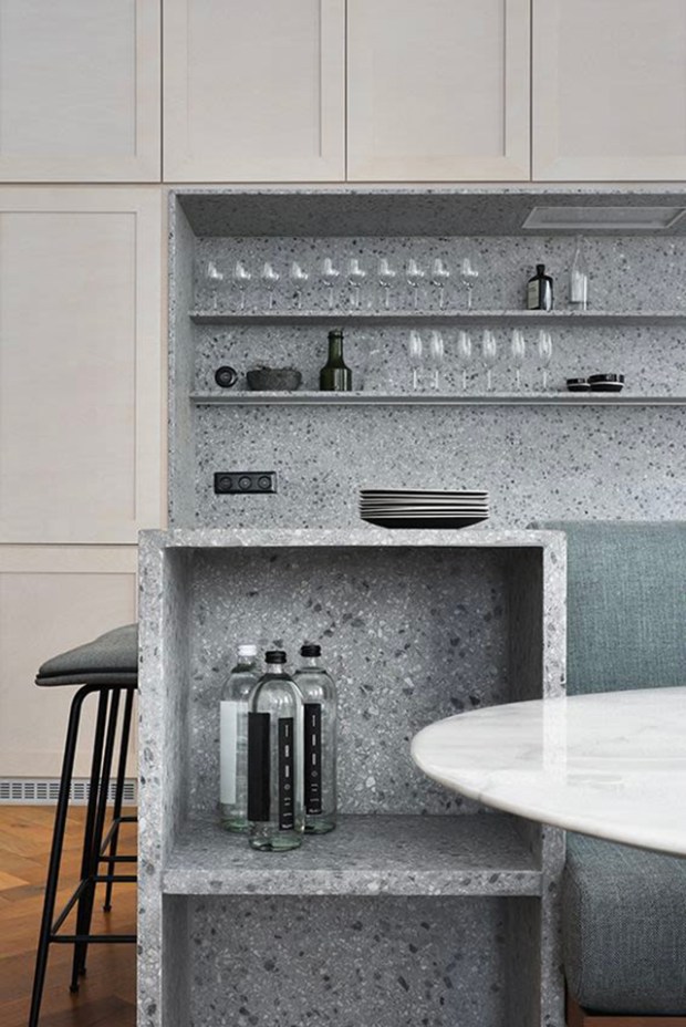 - Le terrazzo, matériau décidément à la mode s’invite aussi bien dans la cuisine que dans la salle de bain.