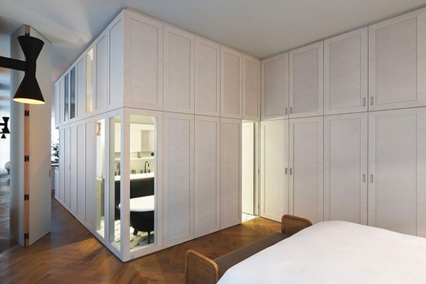 Le nouveau plan de l’appartement « comme une pièce unique et continue » est marqué par la présence d’une nouvelle salle de bain au centre de l’appartement. Les architectes ont placé un bloc de bois dans la pièce nue, qui communique avec tous les autres espaces de vie. Cette solution structure l’appartement tout en apportant de la lumière dans la salle d’eau.