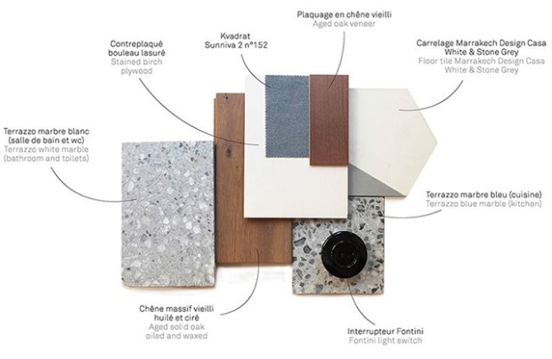 Dans la salle de bains, par exemple, le terrazzo avec des éclats de marbre blanc complète les motifs graphiques des carreaux au sol. Dans les pièces à vivre, les revêtements en tissu bleu-gris s’harmonisent avec les murs en grès de l’immeuble haussmannien et le parquet en chêne à chevrons. Certaines pièces de mobilier, dans la cuisine notamment ont été réalisées sur-mesure, tandis que l’éclairage artificiel est assuré par des appliques Le Corbusier.
